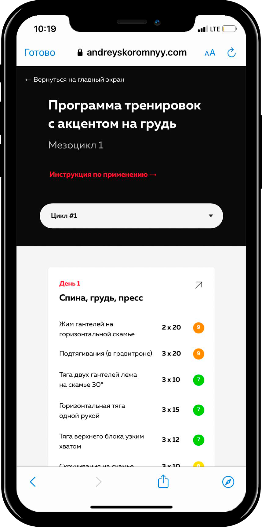 В моих программах используется научный метод RPE: напротив каждого упражнения стоит циферка от 6 до 10, где 6 – четыре повторения до отказа, 7 – три повторения и т. д., 10 – это отказ.